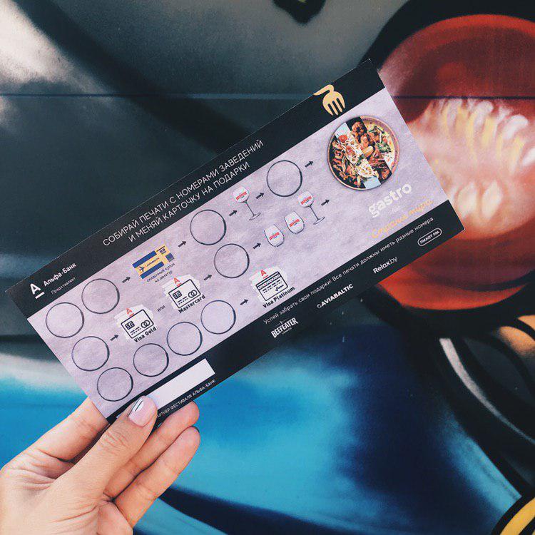 - В любом заведении-участнике можно получить карточку для сбора печатей. СПЕШИТЕ ЗАБРАТЬ СВОЮ КАРТОЧКУ, ИХ КОЛИЧЕСТВО ОГРАНИЧЕНО. Если вдруг вам забыли её вручить, то не стесняйтесь напомнить!