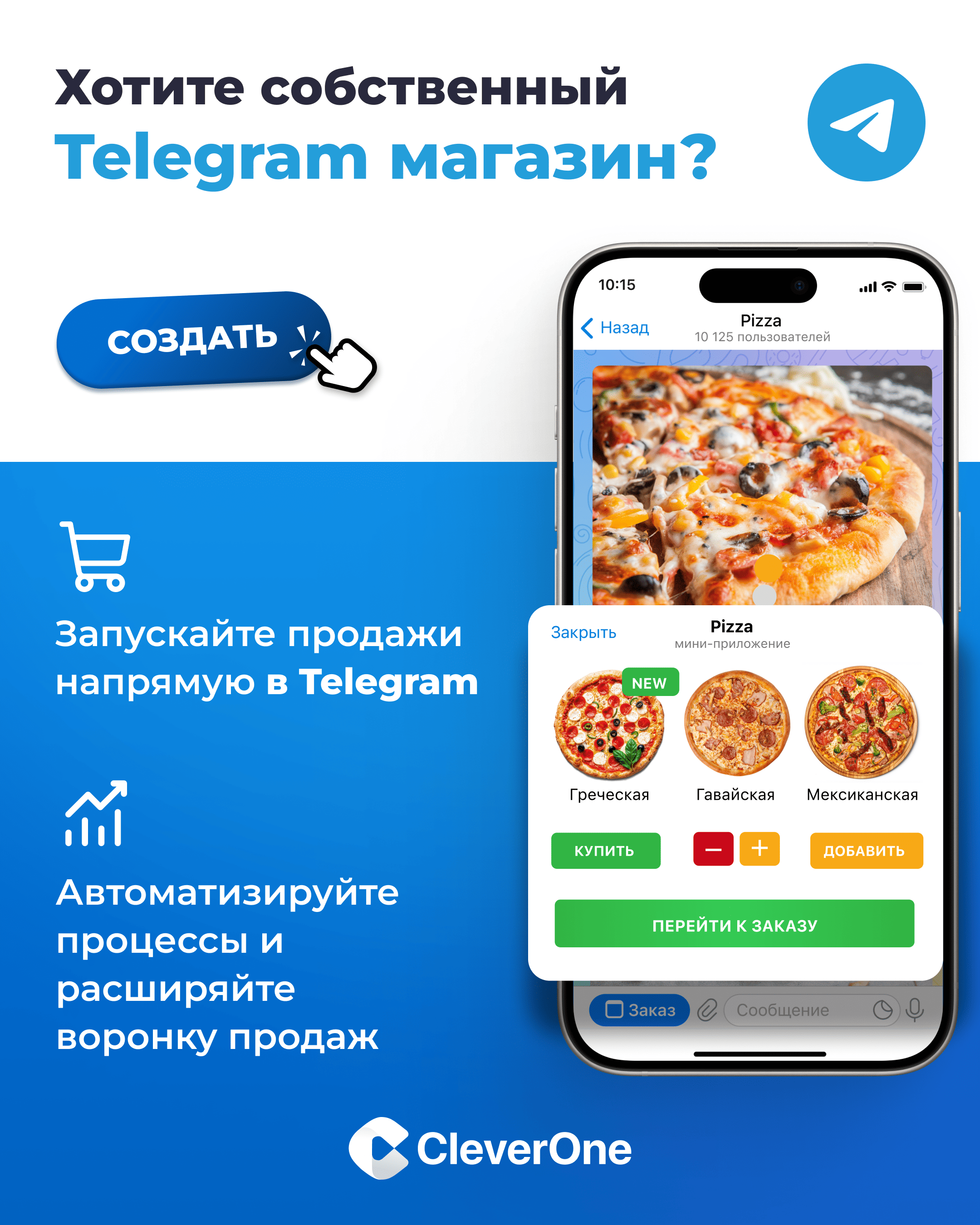 Хотите запустить продажи прямо в Telegram? CleverOneTech поможет создать умный магазин с автоматизацией процессов и расширенной воронкой продаж!