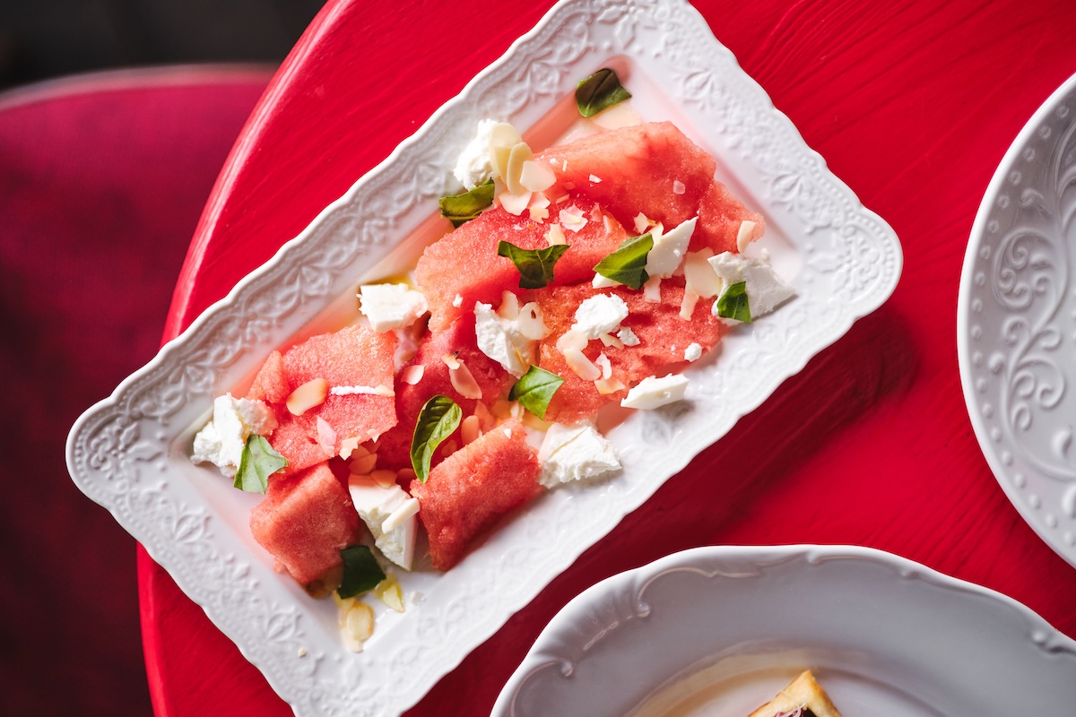 - Салат с арбузом, сыром фета, оливковым маслом и базиликом