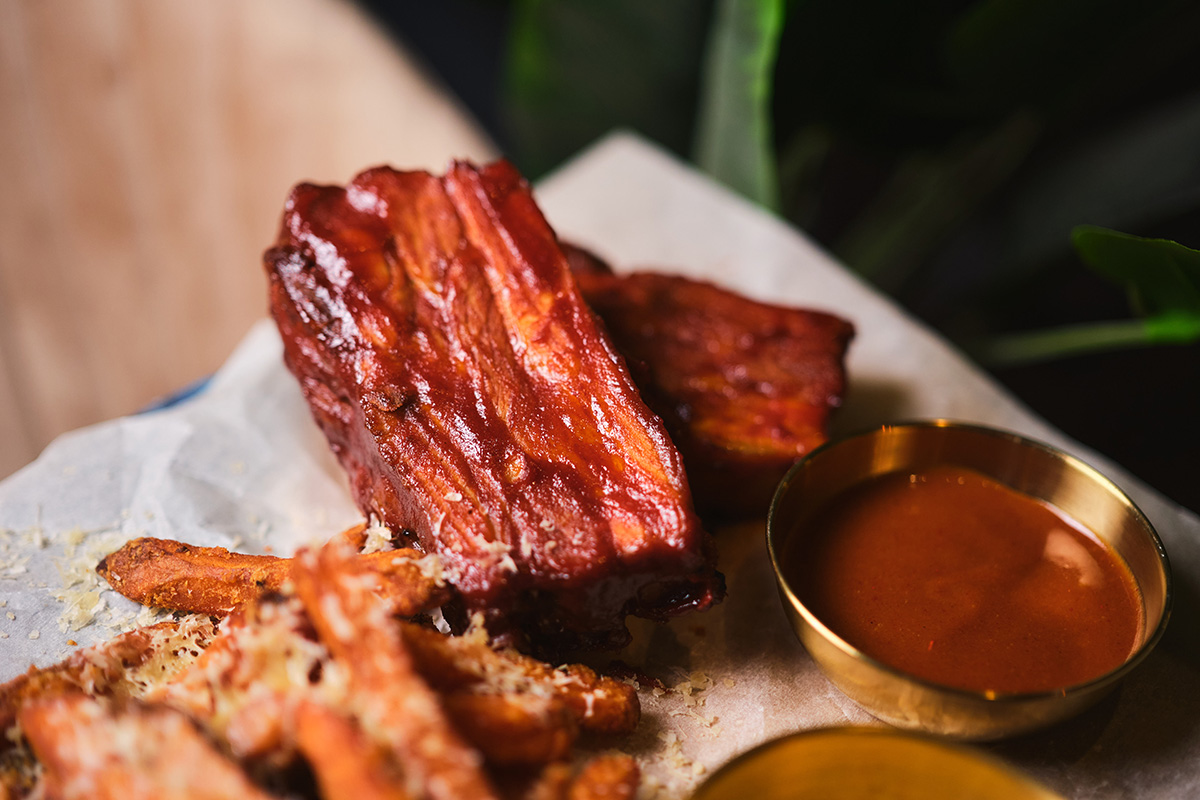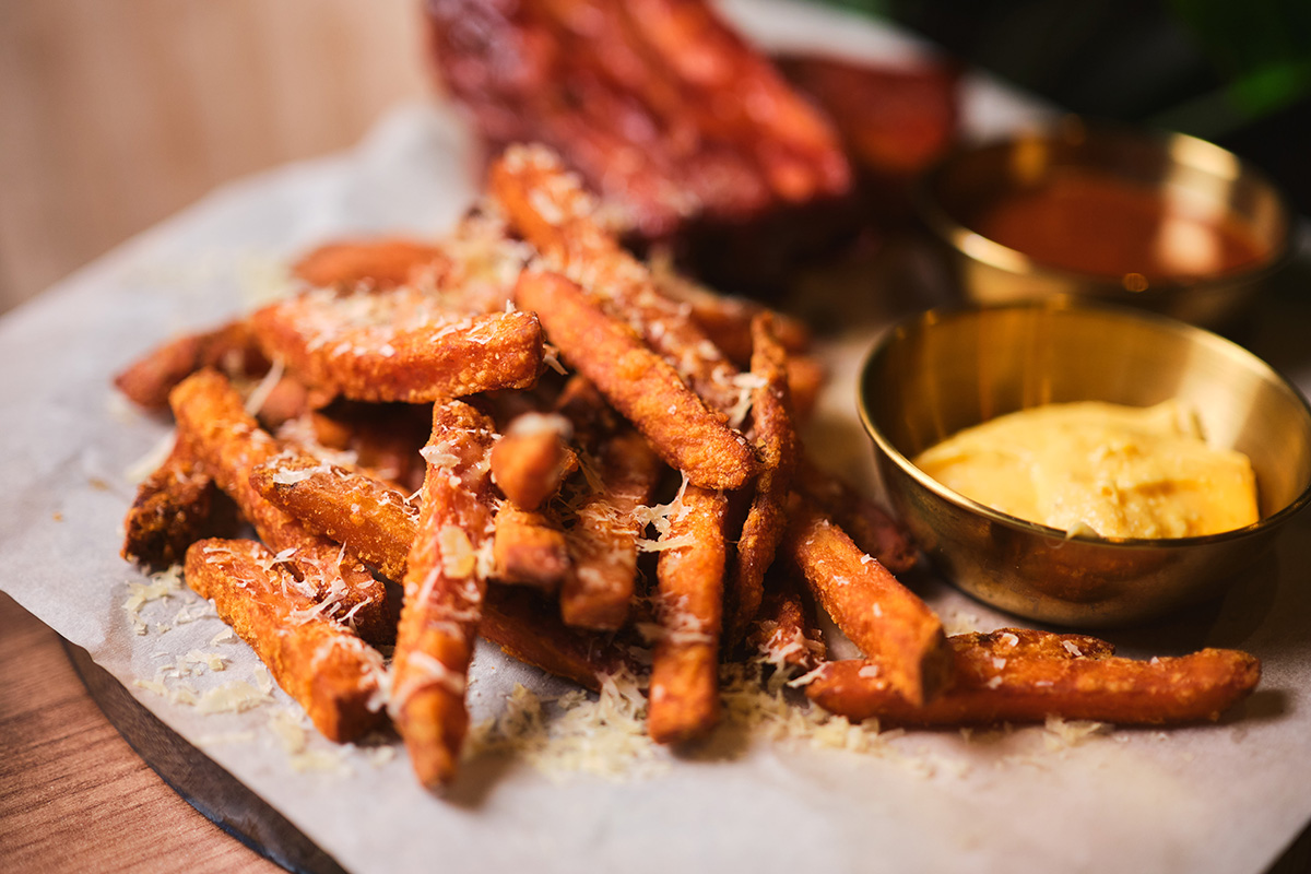 - Томленые свиные ребра в глазури с бататом фри, сырным соусом и барбекю