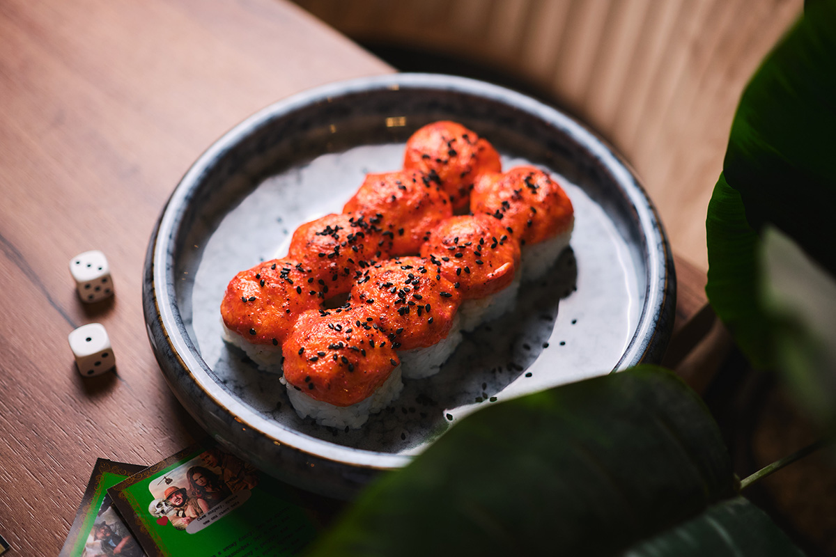 - Ролл с креветкой и снежным крабом с пармезановой шапкой