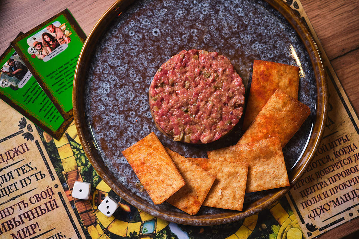 - Тартар из говядины с хрустящей тортильей, соусом ворчестер и шрирача