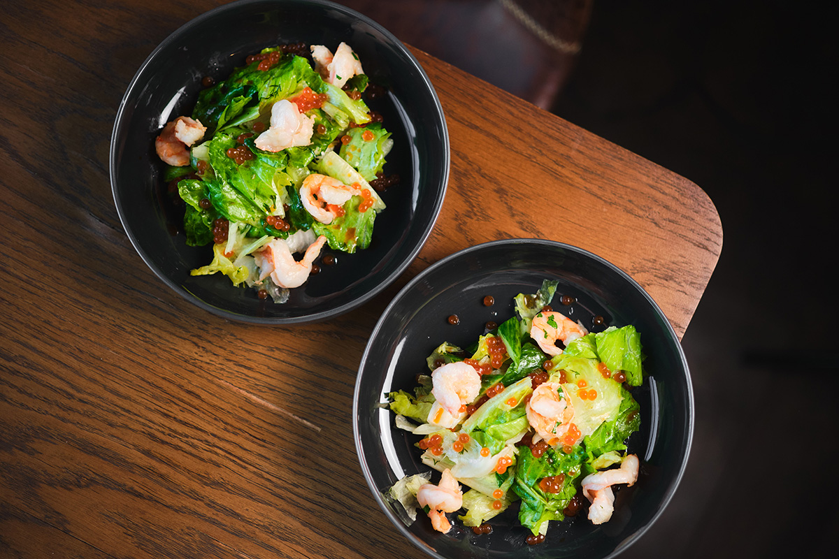 - «Чистая работа» (салат с креветками, битыми огурцами и имитированной икрой: фирменная заправка, папричное масло)