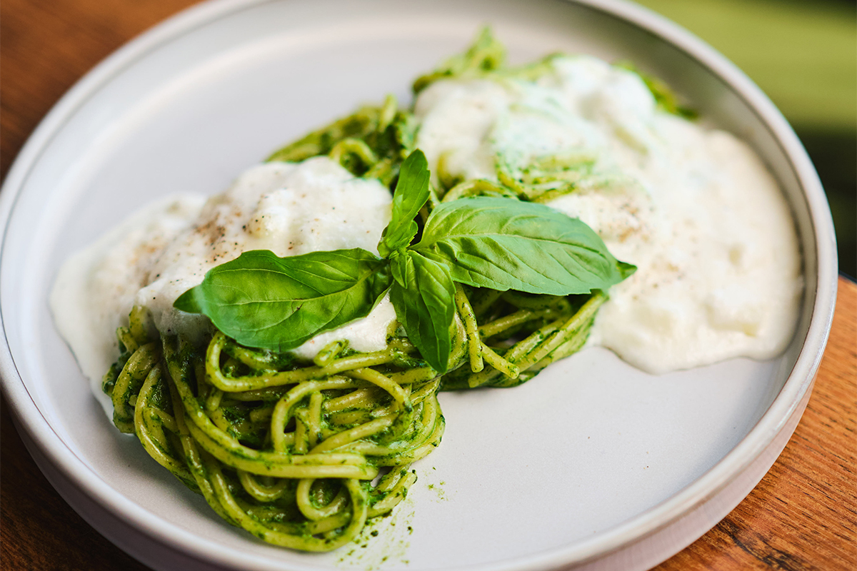 - Лапша Гусеница Абсолем (спагетти со шпинатом в сливочном соусе с домашней страчетеллой)