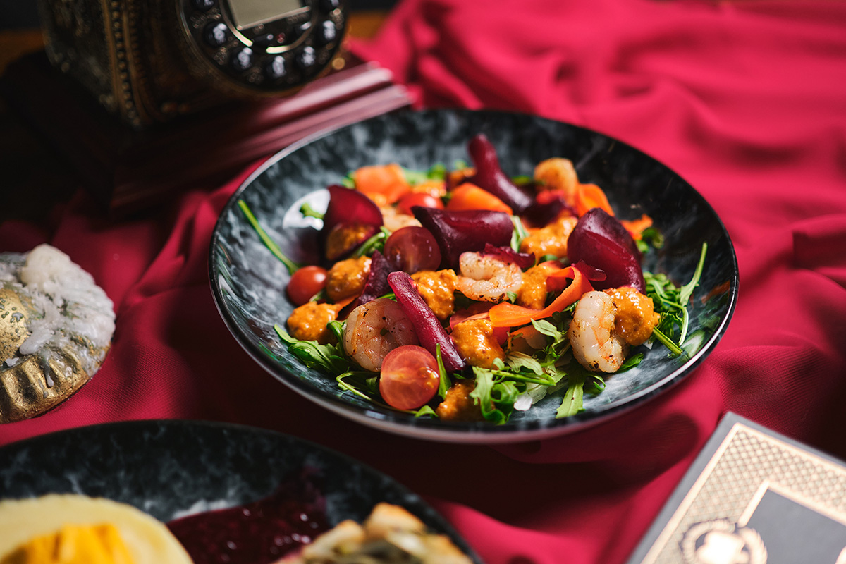 - Салат «Встреча на Патриарших» (тигровые креветки с миксом салата, свёклой, морковью и томатом черри под медово-горчичным соусом)