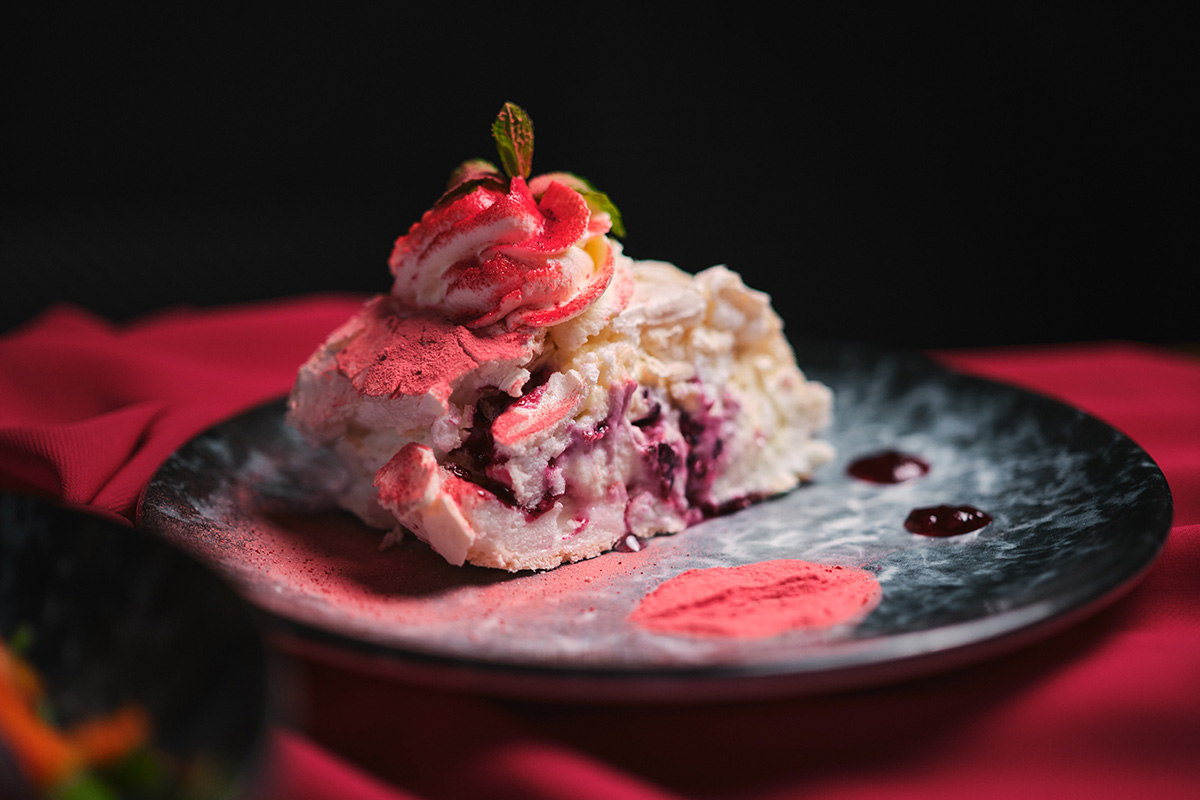 - Десерт «Поцелуй Маргариты» (меренговый рулет с чёрной смородиной, джемом из ежевики и свежими ягодами)