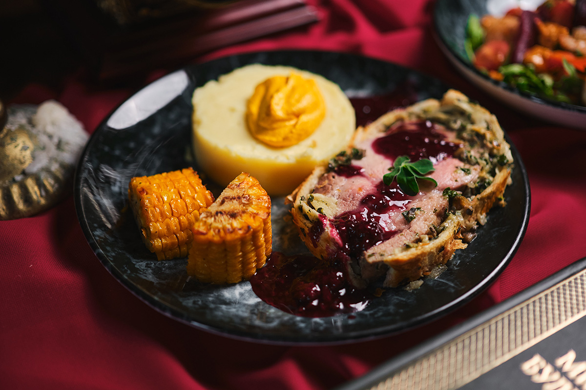 - Основное блюдо «Пир у Воланда» (веллингтон из свинины с картофельным пюре, пюре из моркови и початками кукурузы, дополняется ежевичным соусом и микрозеленью)