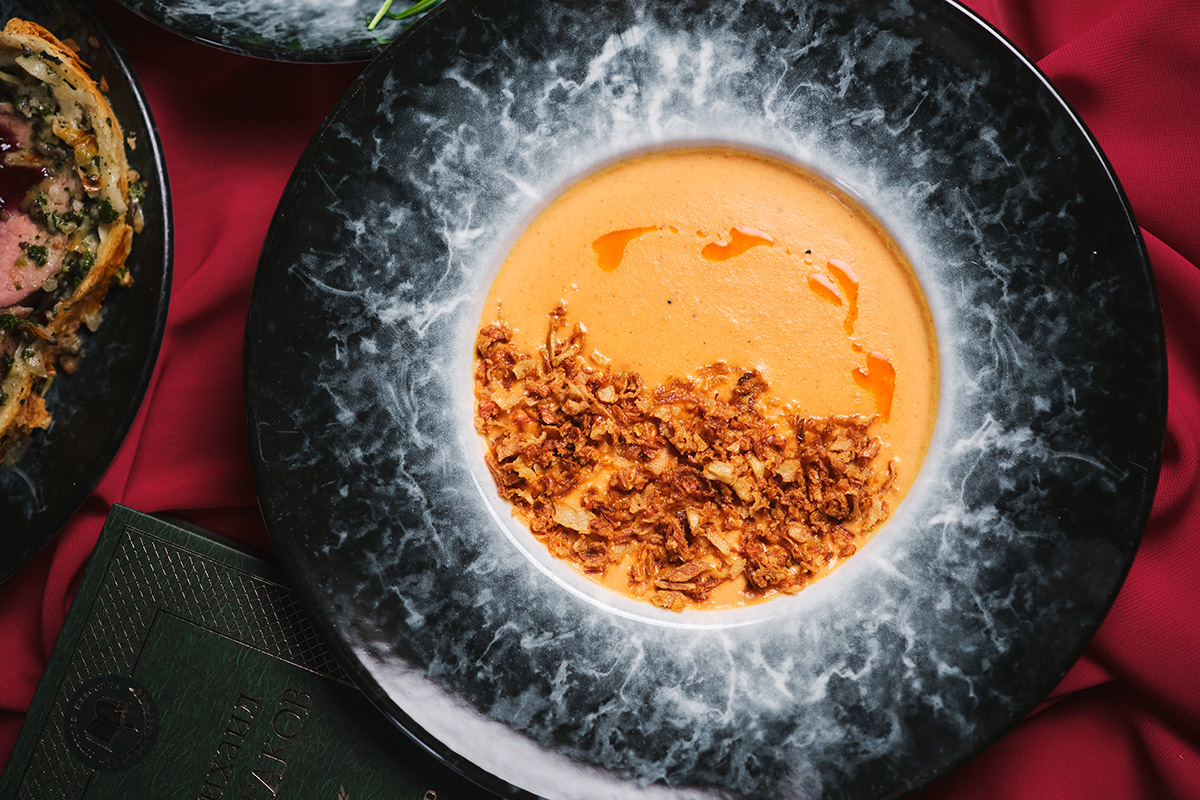 - Крем-суп «Строки между строк» (cливочный крем-суп с форелью, картофелем и морковью дополняется хандаши и кимчи, подаётся с микрозеленью, луком фри и фокаччей)