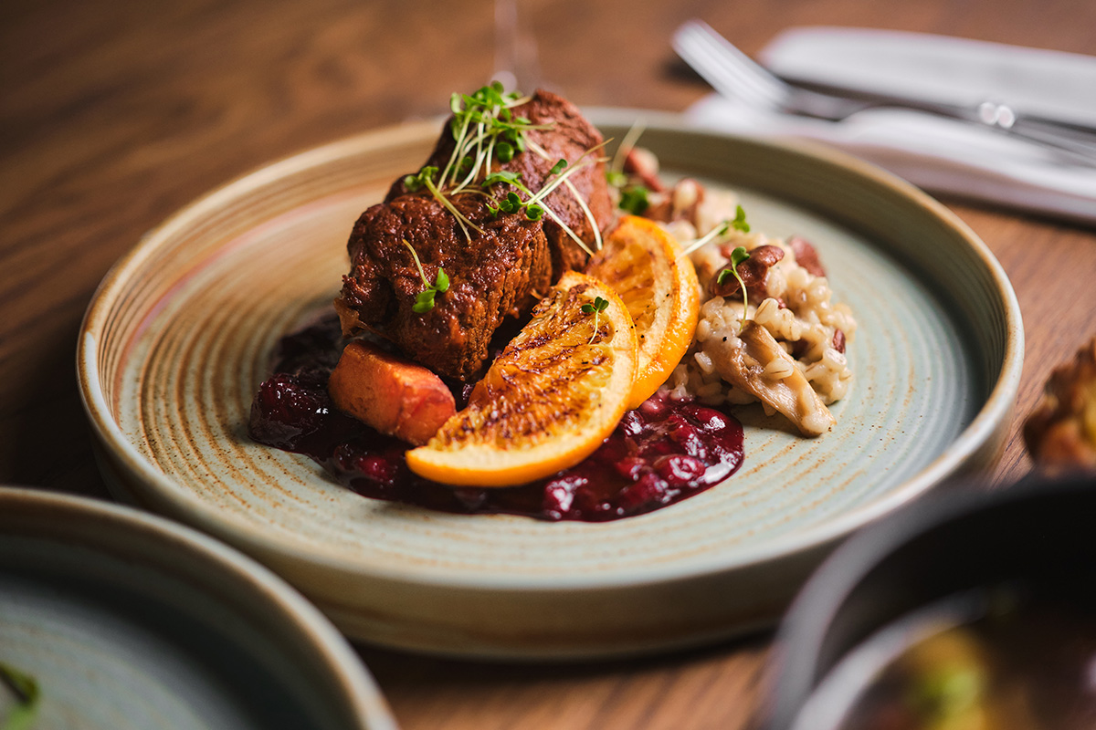 - Томленая говядина на лесных ягодах с грибным орзотто из перловки