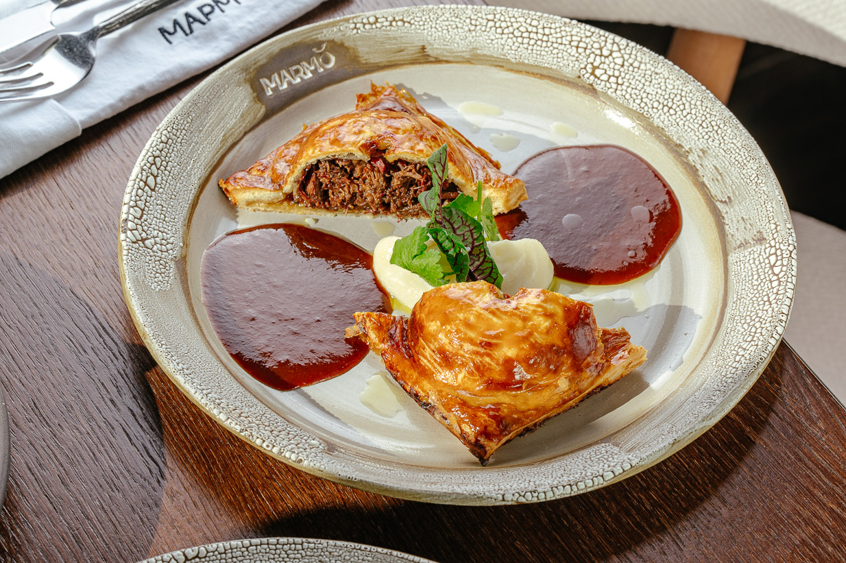 Пирог с рваной говядиной – главная сделка. Томлёное мясо, плотная текстура, насыщенный вкус. То, что держит удар и не рассыпается при первой же проверке.
