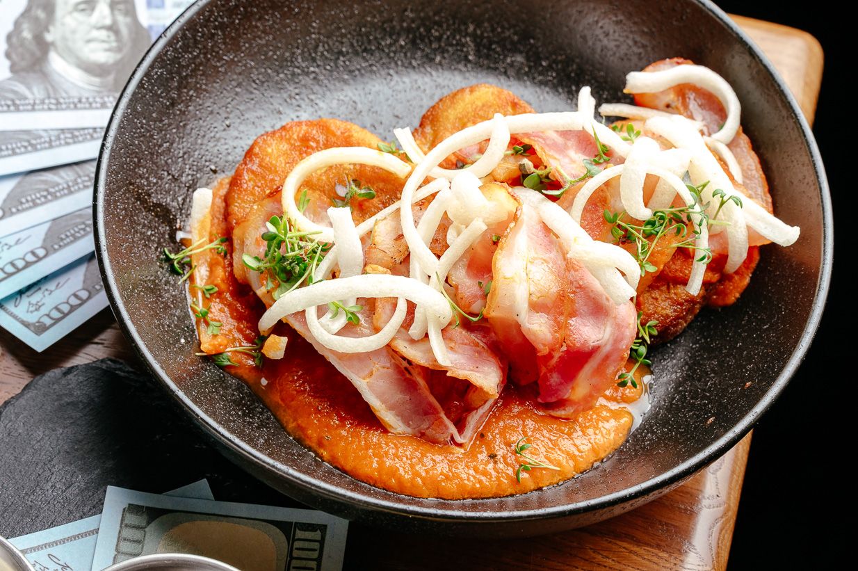 - Хашбрауны с хрустящим беконом и соусом сальса