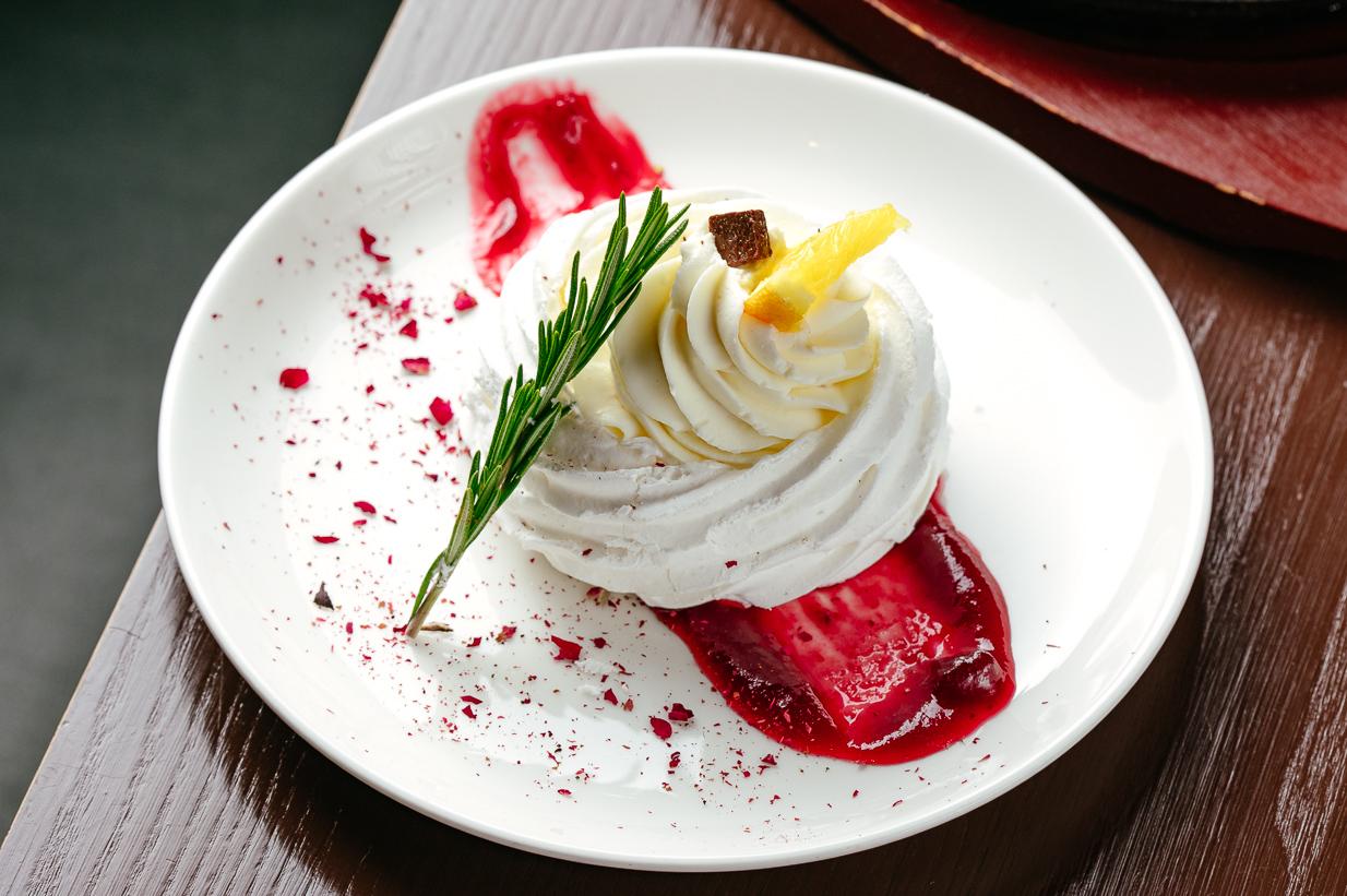 Десерт «Анна Павлова». Лёгкий, как облако, сладкий, как его поцелуй. Ягодное конфи напоминает, что жизнь – это не только поиски, но и находки.