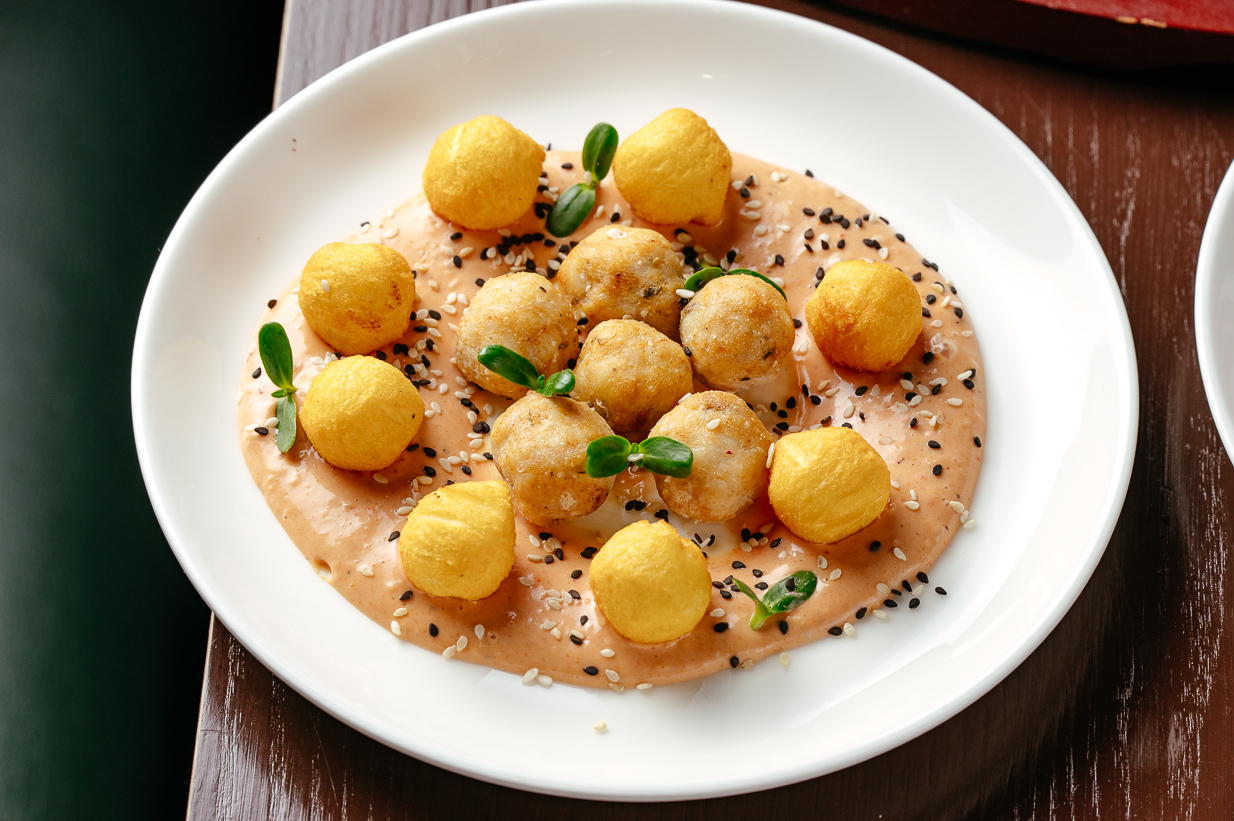 - Куриные митболы с картофельными крокетами и чесночным соусом