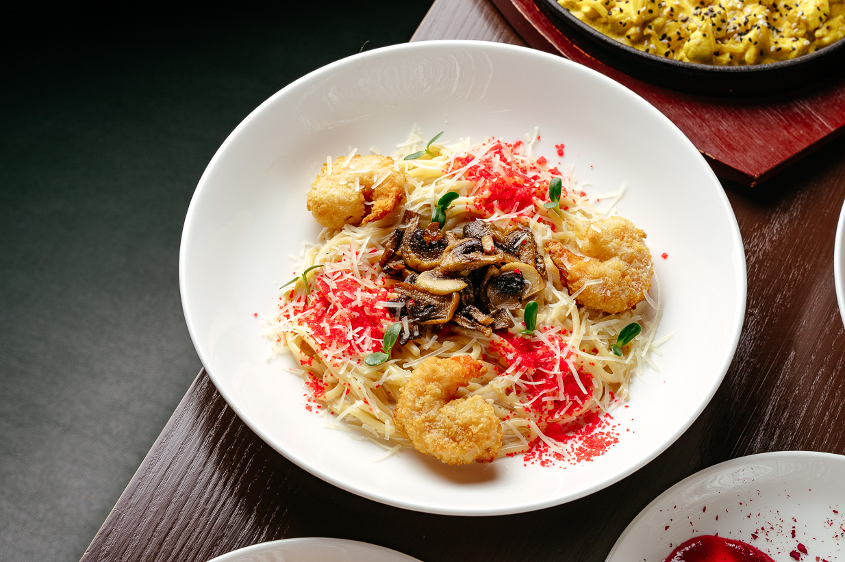 - Паста в сливочно-устричном соусе с креветками темпура, икрой тобико и шампиньонами