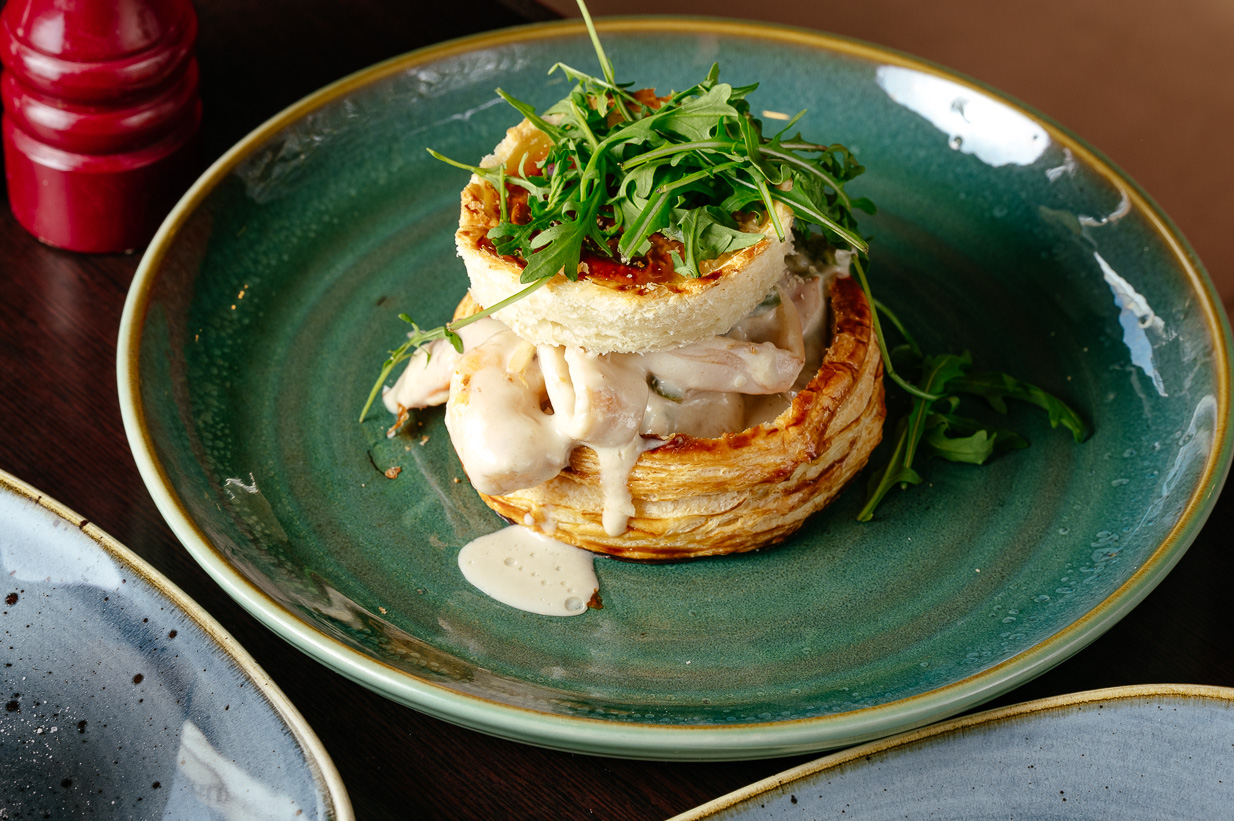 - Волован с морепродуктами и соусом бешамель