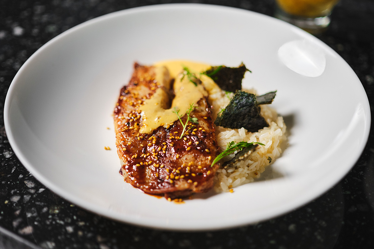 - Тилапия с рисом жасмин, голландским соусом, кунжут юдзу