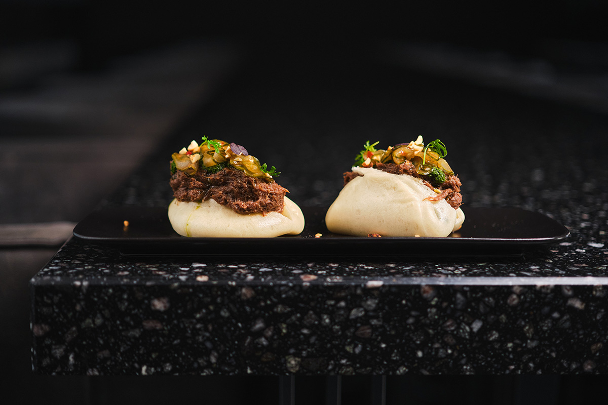 - Булочки Бао с томленой говядиной, мятным соусом и арахисом чили