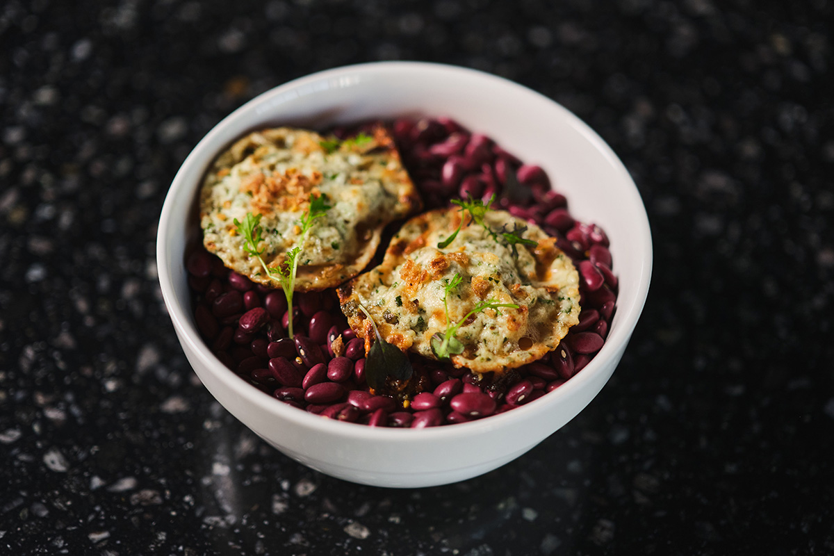 Всё начинается с морского гребешка под соусом Рокфеллер — именно моллюски открывали трапезу как жест статуса: море здесь не угроза, а обслуживающий персонал. Домашние хлебцы со злаками — как интерпретация разделения общества.