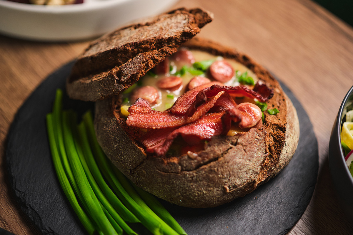 - Похлебка "Журек" с копченостями на ржаной закваске в хлебе от шефа во дворце Боклера