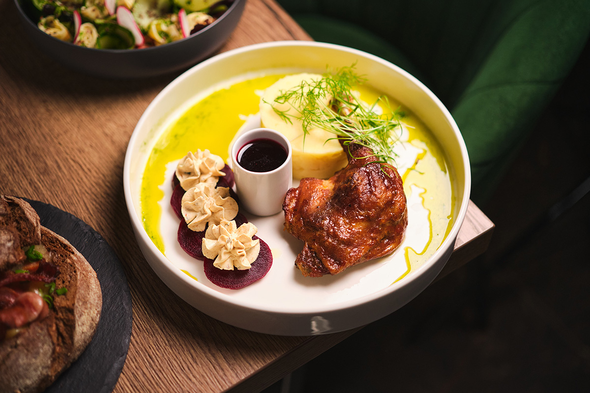 - Окорочек селезня из озер Северного королевства под брусничным соусом с картофельным пюре, печёной свеклой и пряным сливочным сыром