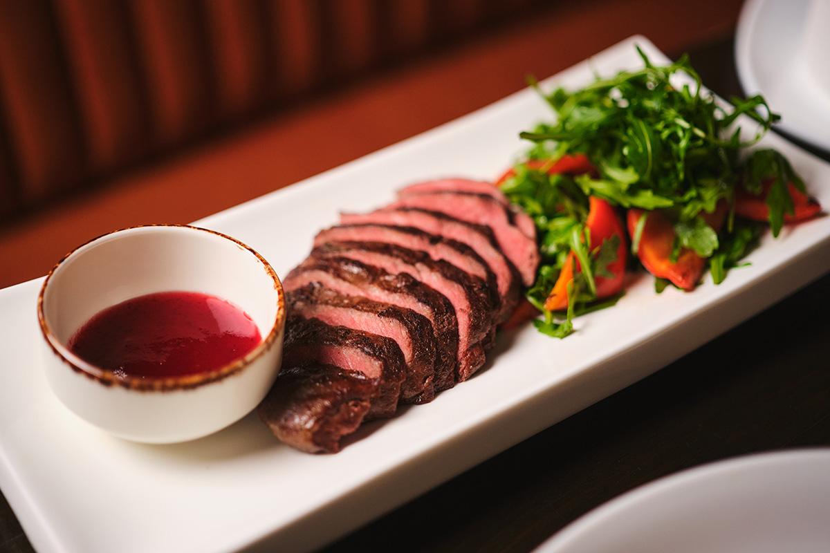 - Стейк из говядины с клюквенным соусом и болгарским перцем на гриле