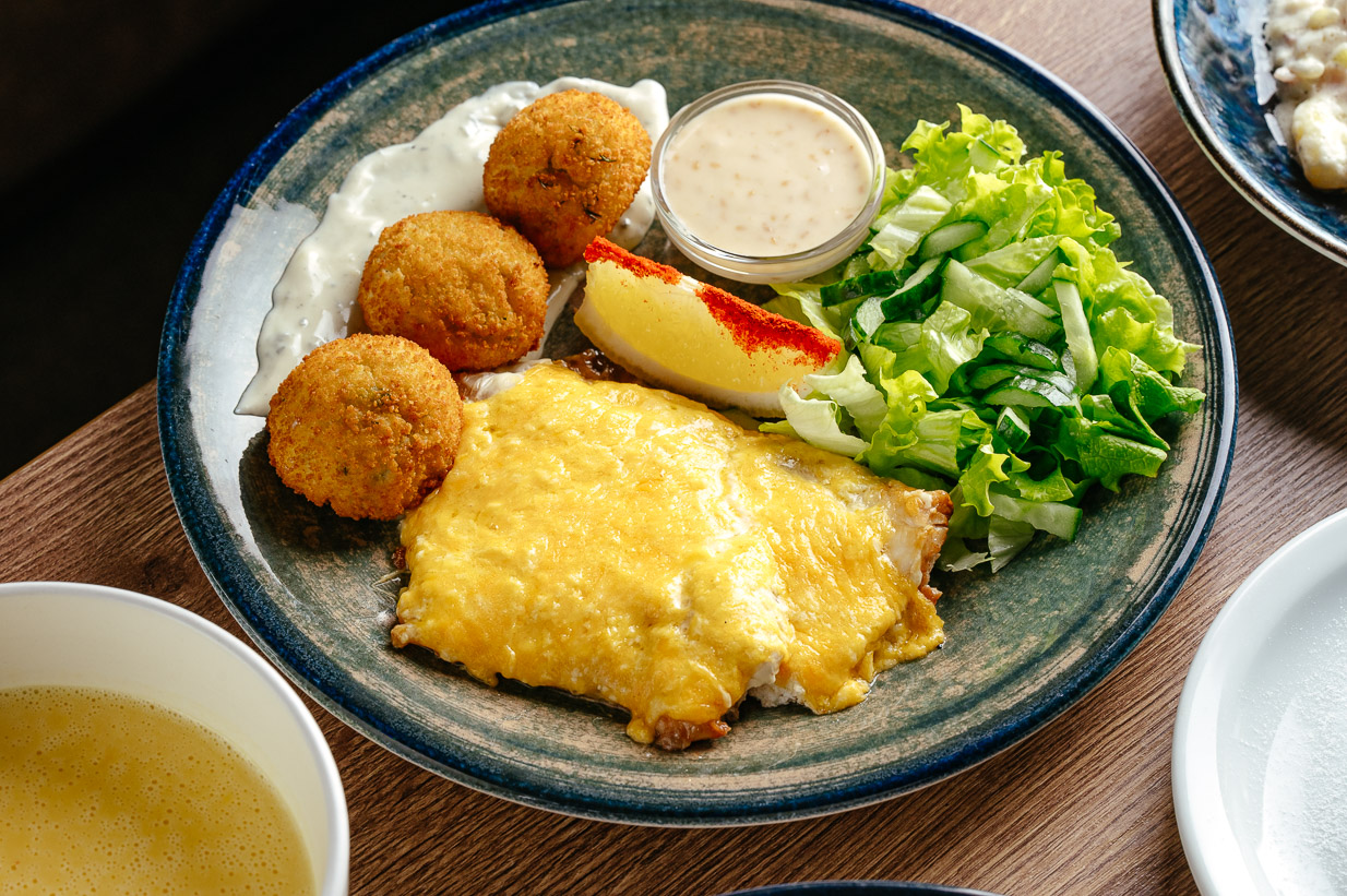 - Филе белой рыбы с картофельными шариками и соусом дорблю