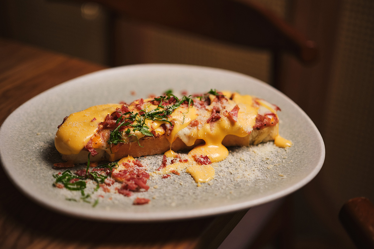 - Брускетта «Утренняя кража»: чиабатта, сыр моцарелла, жареный бекон, сырный соус