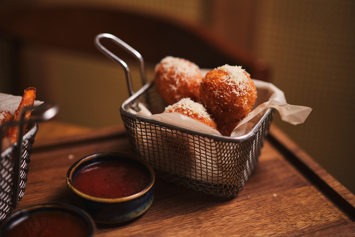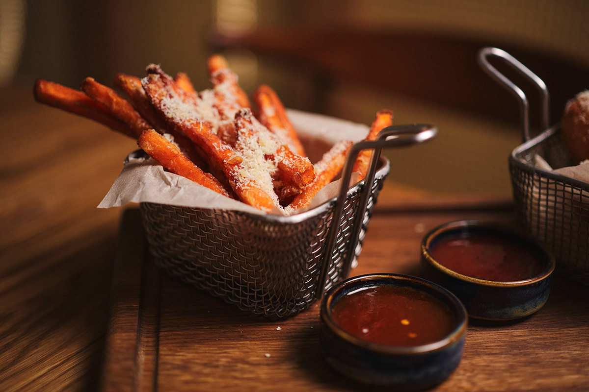 - «Рыжие шарики и батат с пармезаном»: рисовые шарики с сыром чеддер, батат с сыром пармезан, соус брусничный, соус острый мед