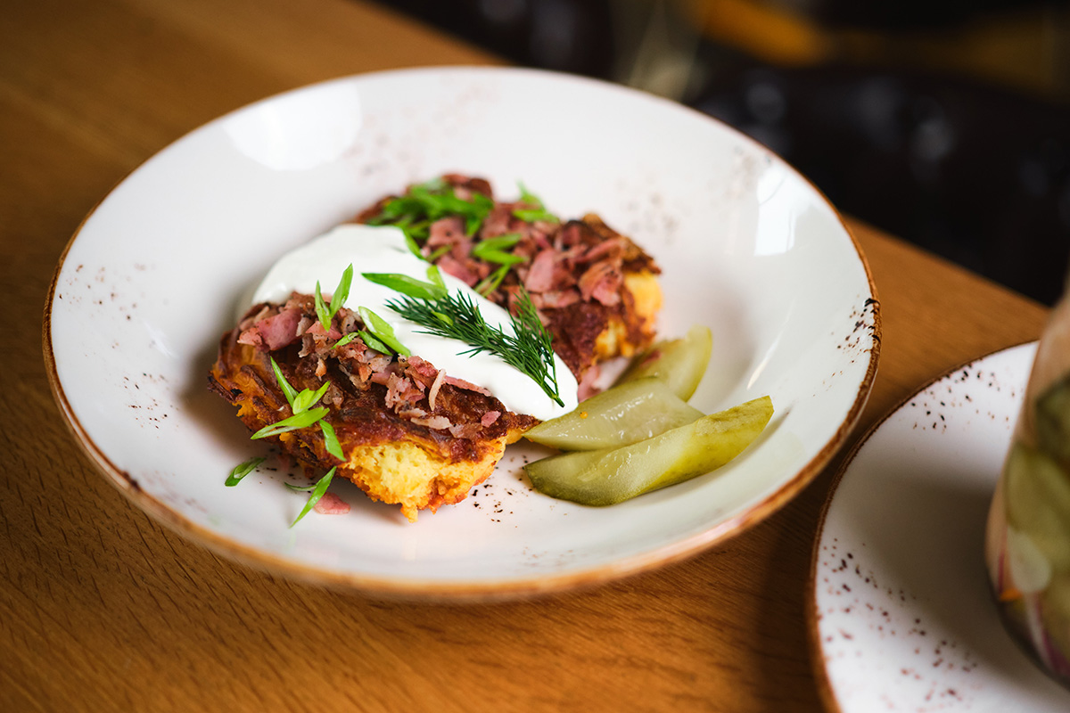 - Пастуший пирог (картофельный пирог запеченный со свининой и сыром. Подается с обжаренной грудинкой, домашней сметаной и пикули)