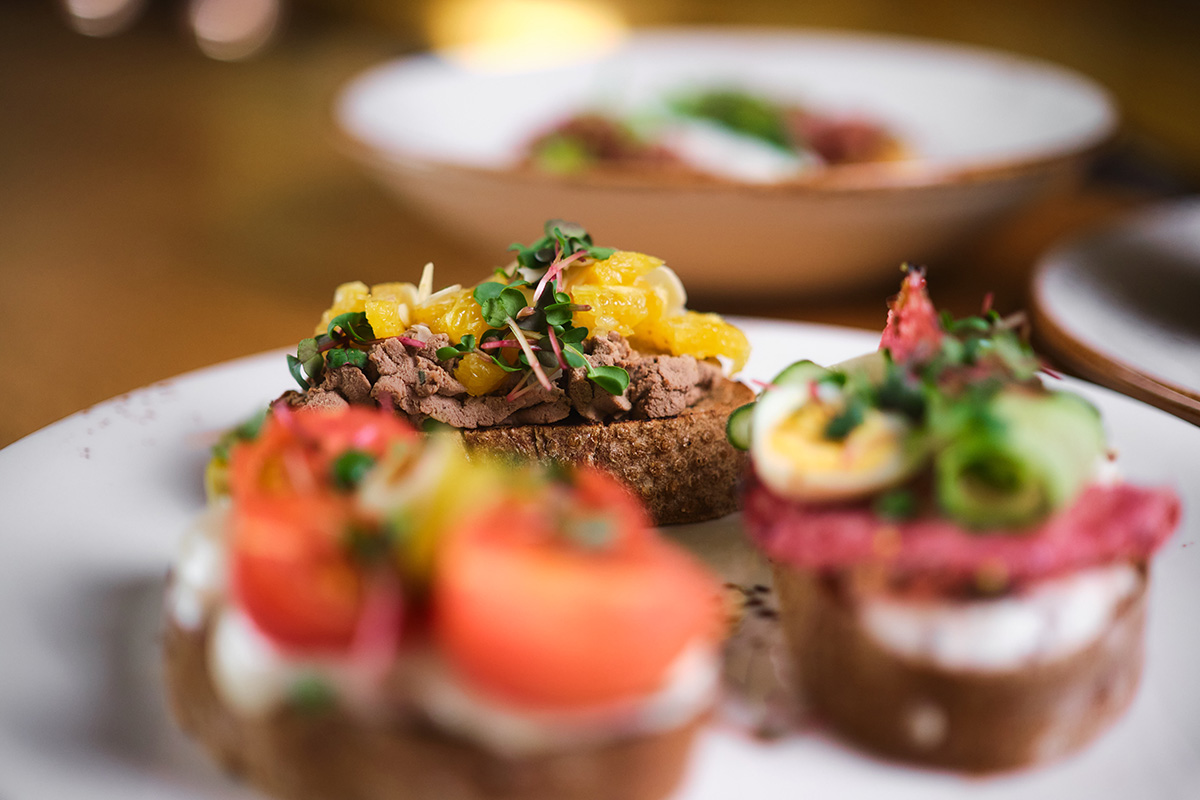 - Трио брускетт: брускетты на домашней чиабатте с сырным кремом, томатами и сладким чили / с нежным кремом, черносливом, салями и пикули / с паштетом из птицы, филе апельсина и миндалем