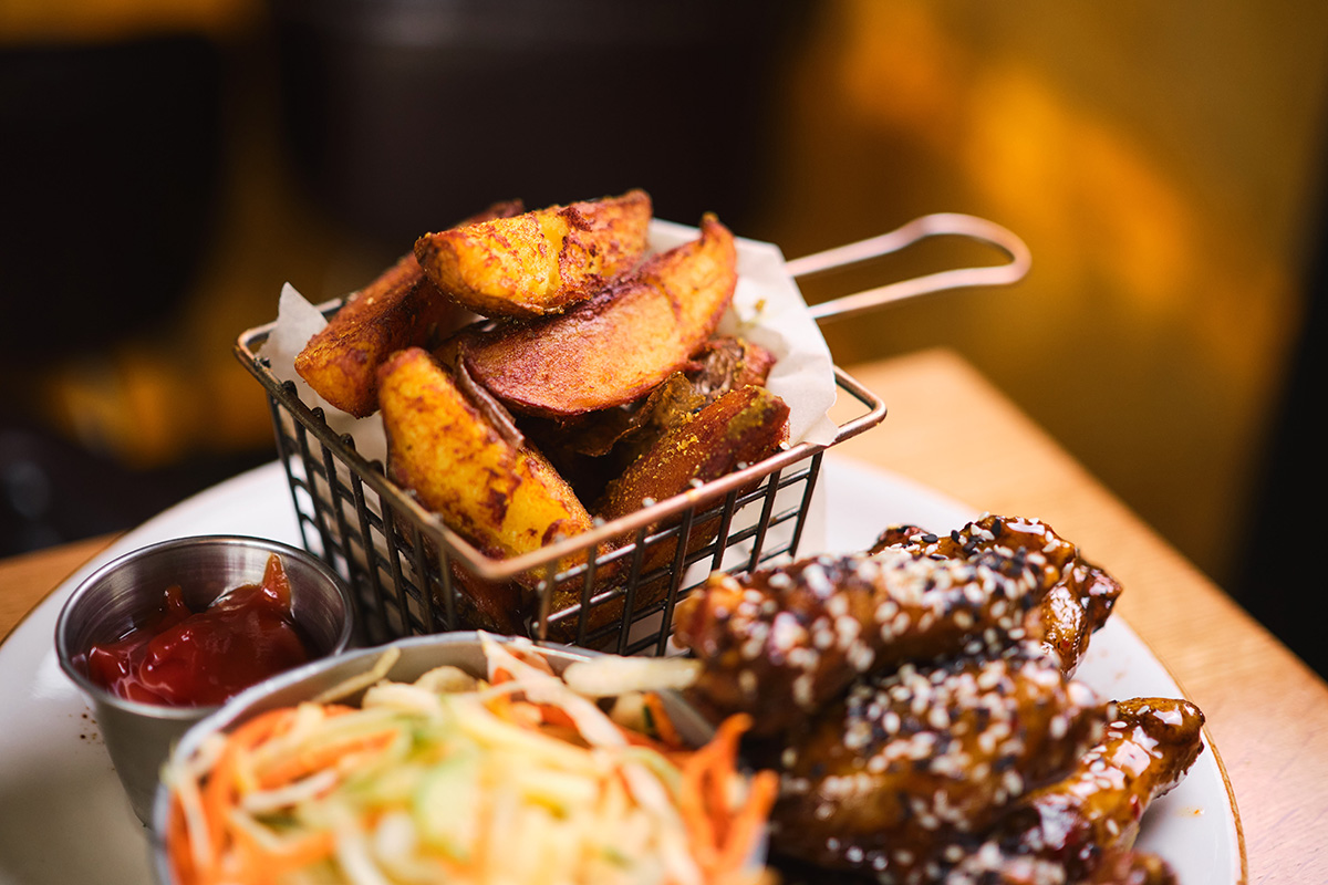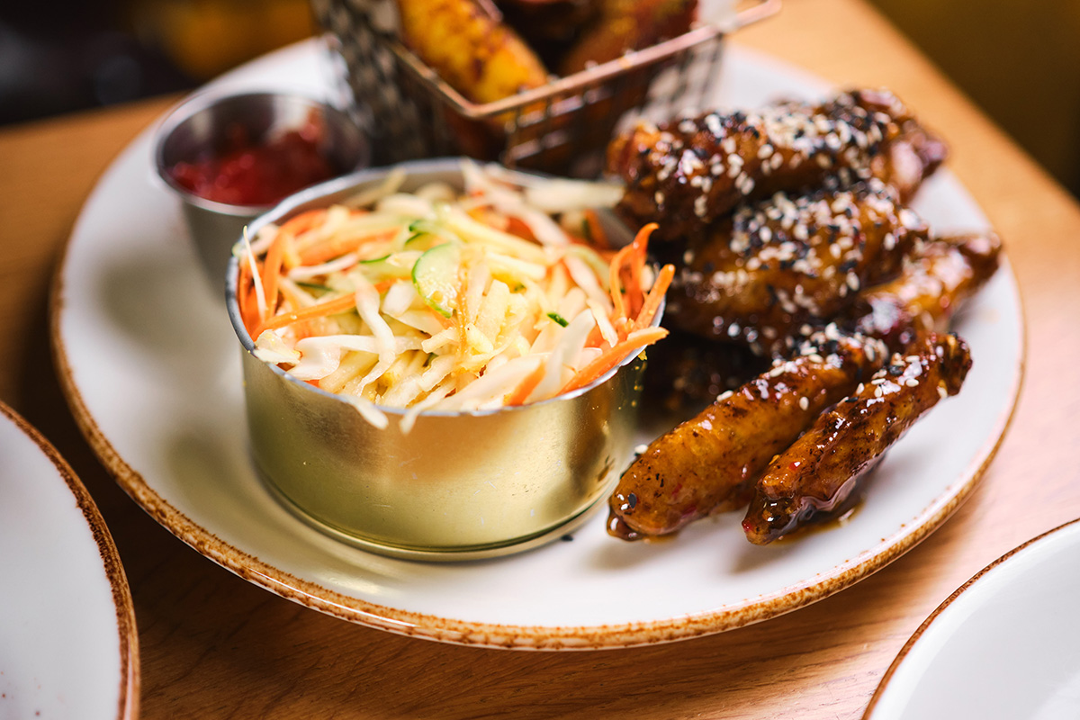 - Крылышки по-австрийски с салатом и деревенским картофелем (куриные крылья в остро-сладкой глазури с печеным деревенским картофелем и освежающим огуречно-яблочным салатом)