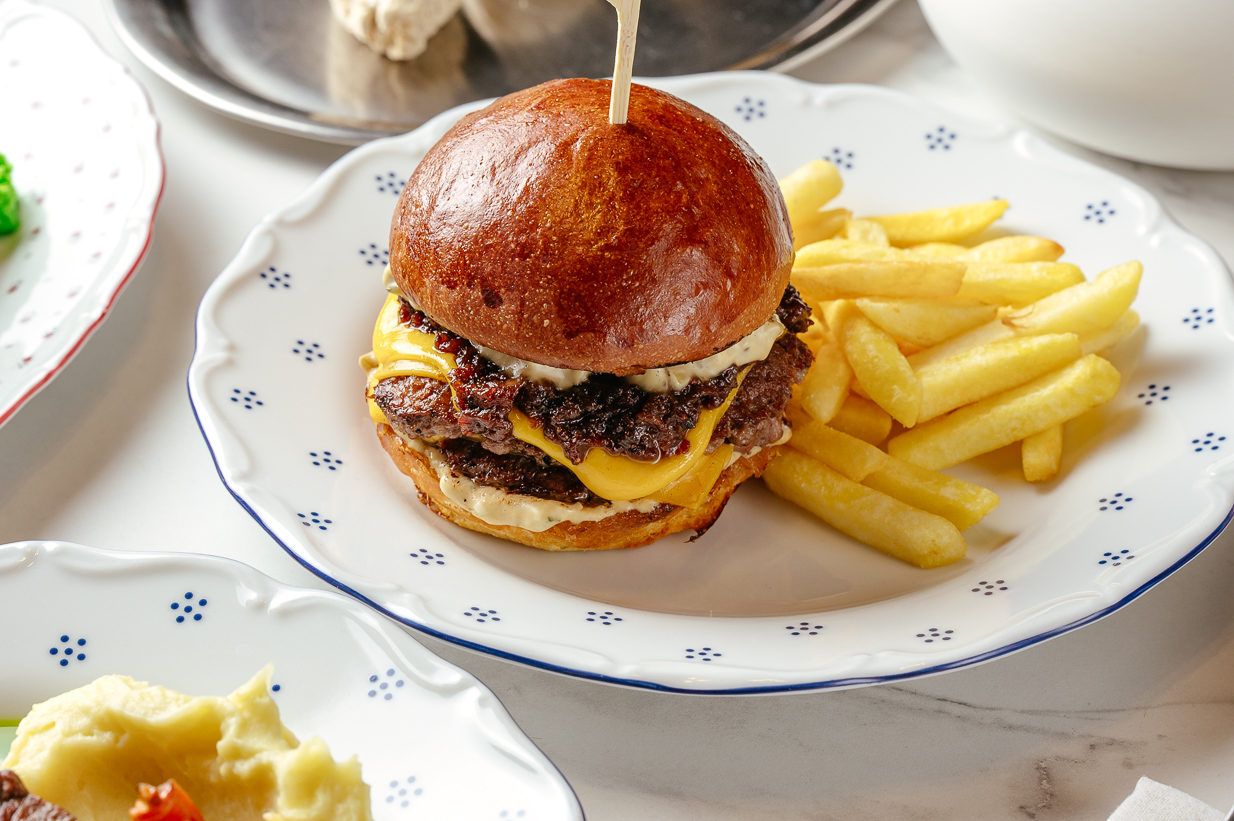 - Чизбургер с джемом бекон-клубника и картофелем фри